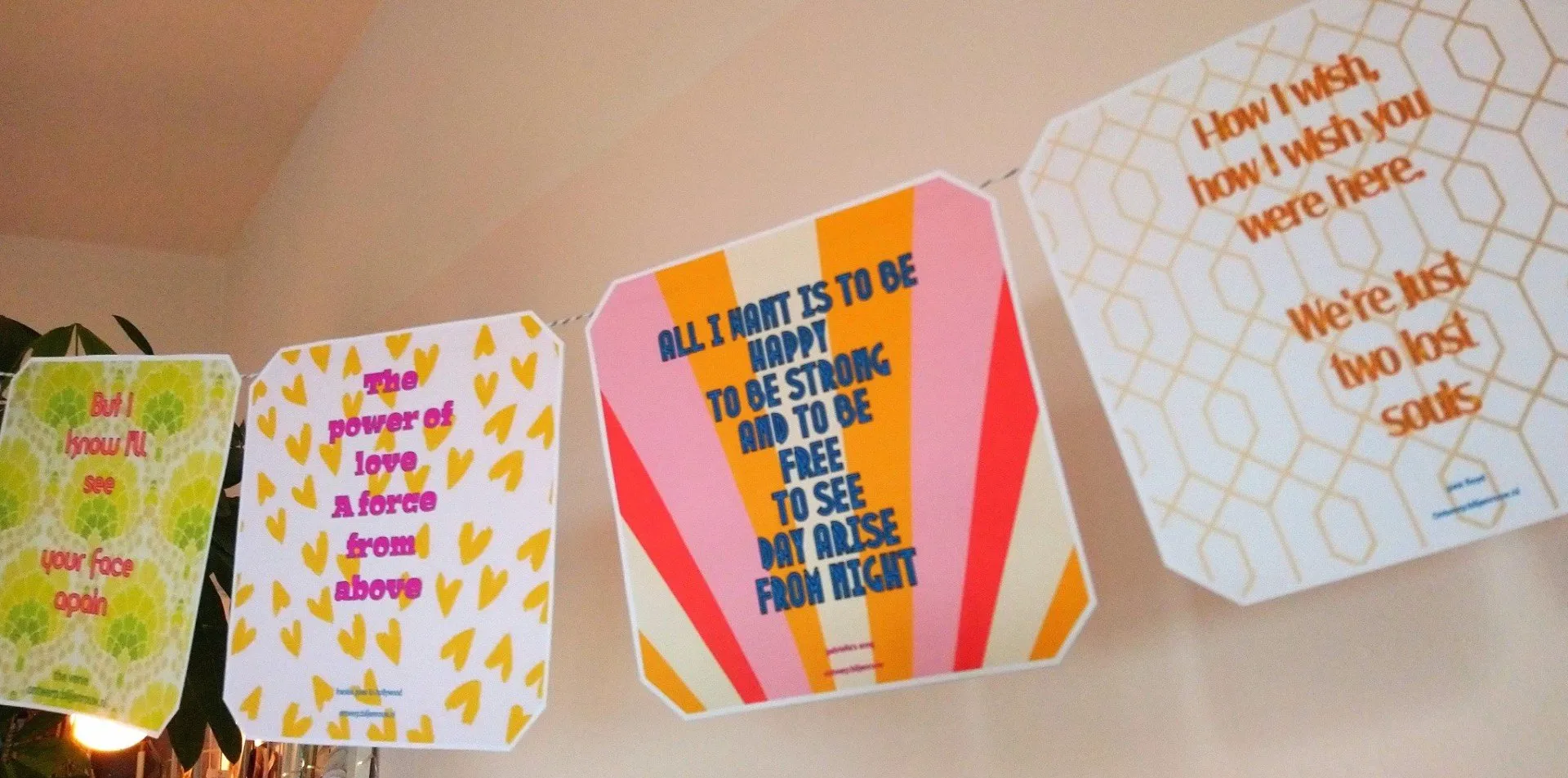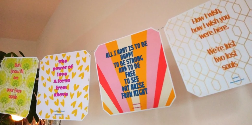 Om je gedenkfeest te versieren heb ik een vlaggenslinger ontworpen met Blij en Rouw teksten uit muziek. Teksten over Rouw waar ik ook een beetje Blij van wordt! Misschien jij ook?