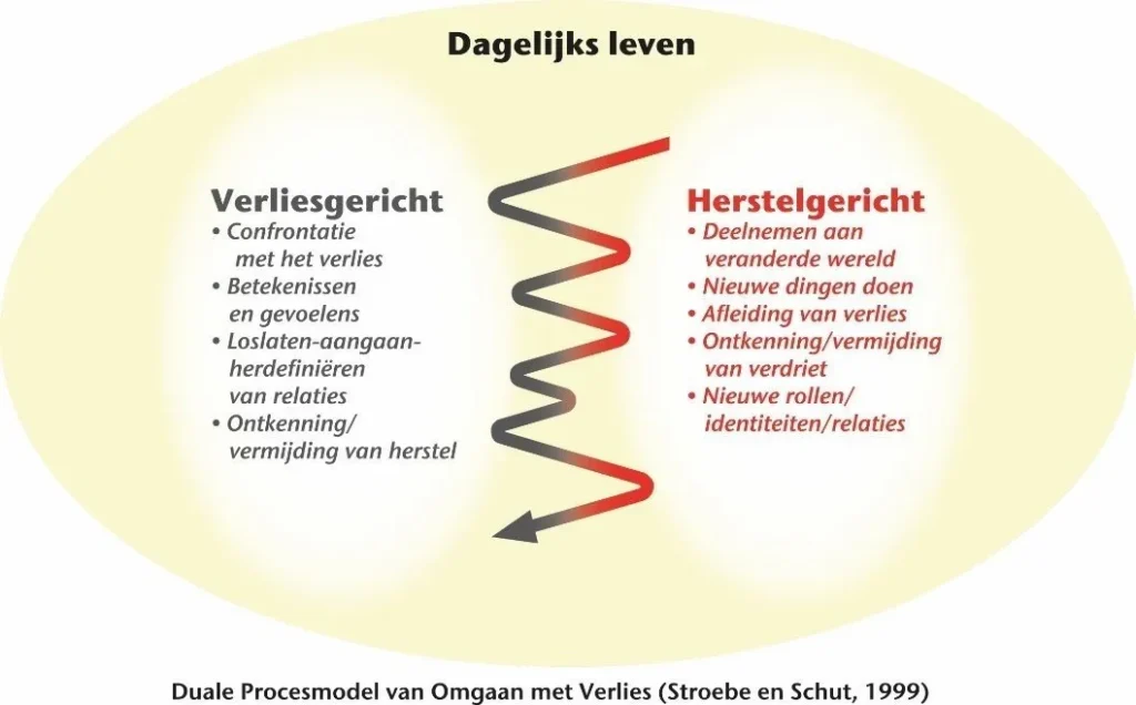Rouwen is een slingerend proces. Het Duale Procesmodel van Omgaan met Verlies (Stroebe & Schut, 1999) laat dit goed zien, zie de afbeelding hieronder. Een rouwend persoon beweegt dynamisch heen en weer, niet volgens vaste patronen. Hij of zij beweegt tussen ‘de confrontatie met het verlies enerzijds’ en ‘het vermijden van het verlies’ anderzijds.